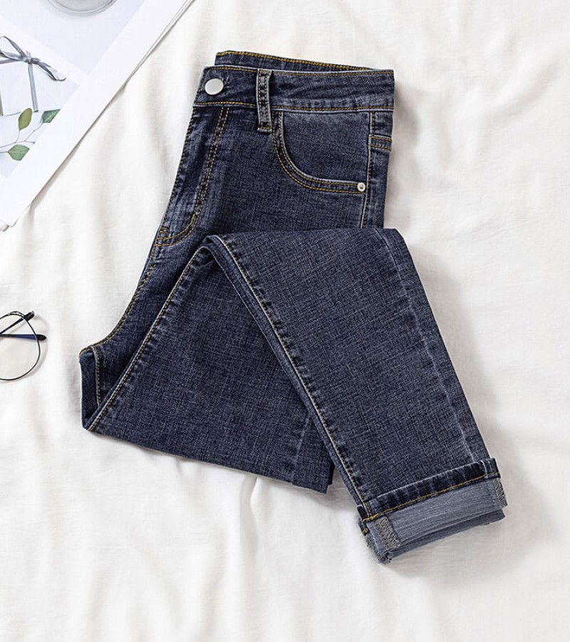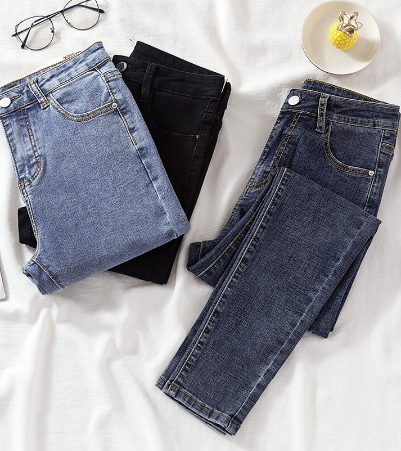 牛仔裤韩国女式高腰全配修身L弹力新镶边铅笔女式牛仔裤潮流