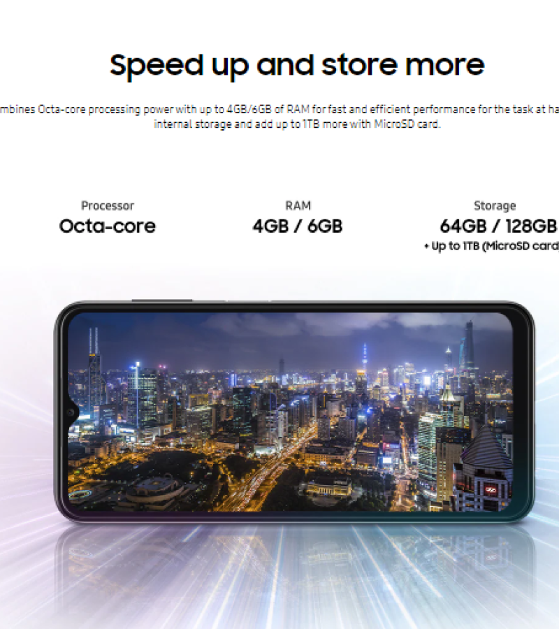 • NETWORKTechnologyGSM / HSPA / LTELAUNCHAnnounced2022, March 04StatusAvailable. Released 2022, March 23BODYDimensions165.1 x 76.4 x 8.8 mm (6.5 x 3.01 x 0.35 in)Weight195 g (6.88 oz)BuildGlass front (Gorilla Glass 5), plastic frame, plastic backSIMSingle SIM (Nano-SIM) or Dual SIM (Nano-SIM, dual stand-by)DISPLAYTypePLS LCDSize6.6 inches, 104.9 cm2 (~83.2% screen-to-body ratio)Resolution1080 x 2408 pixels, 20:9 ratio (~400 ppi density)ProtectionCorning Gorilla Glass 5PLATFORMOSAndroid 12, One UI 4.1ChipsetExynos 850 (8nm)CPUOcta-core (4x2.0 GHz Cortex-A55 & 4x2.0 GHz Cortex-A55)GPUMali-G52MEMORYCard slotmicroSDXC (dedicated slot)Internal32GB 3GB RAM, 64GB 4GB RAM, 128GB 4GB RAM, 128GB 6GB RAM